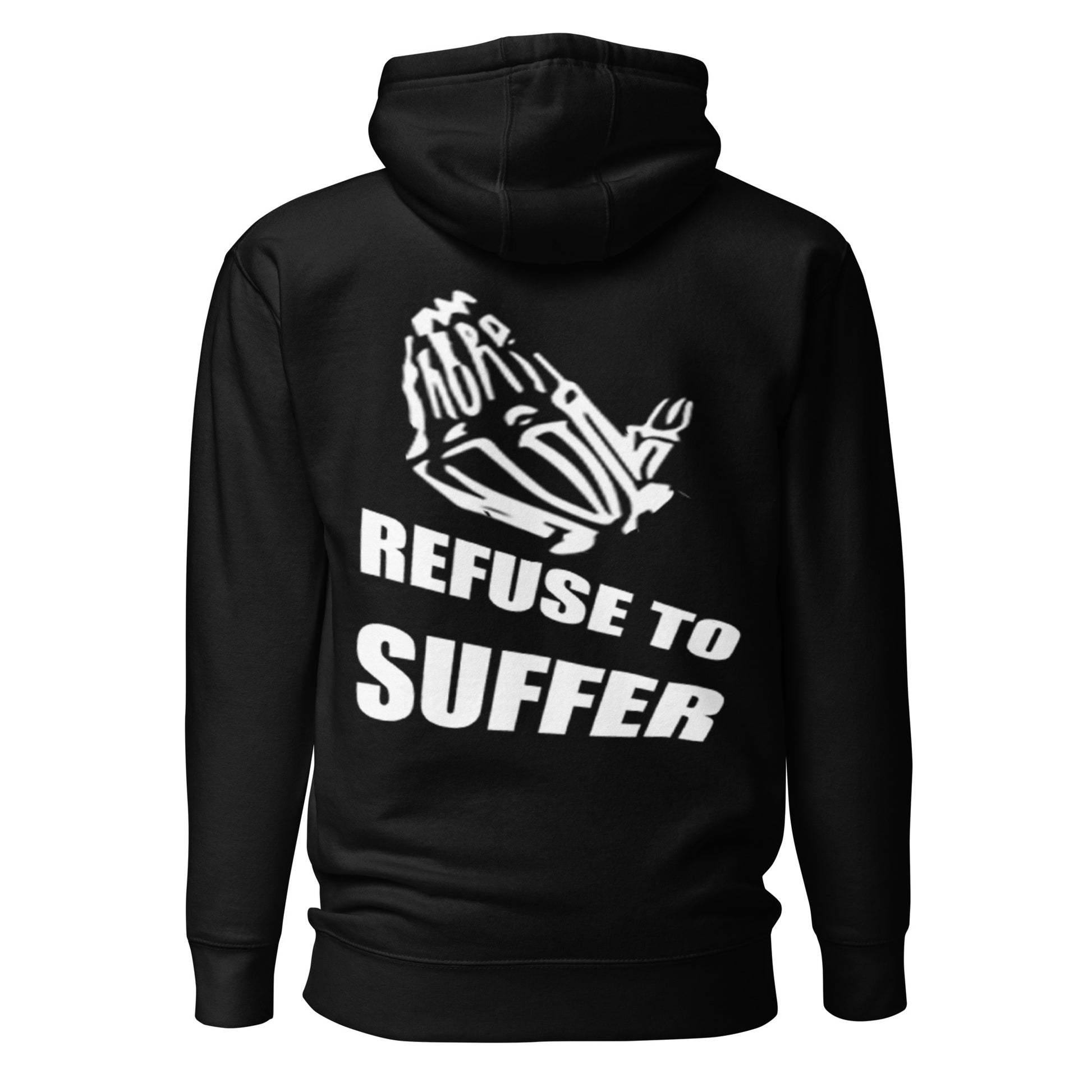 The Refuse to Suffer Unisex Hoodie by Sufferings & Offerings. Heavyweight cotton is cut in a standard fit and finished with a banded fixed hood.